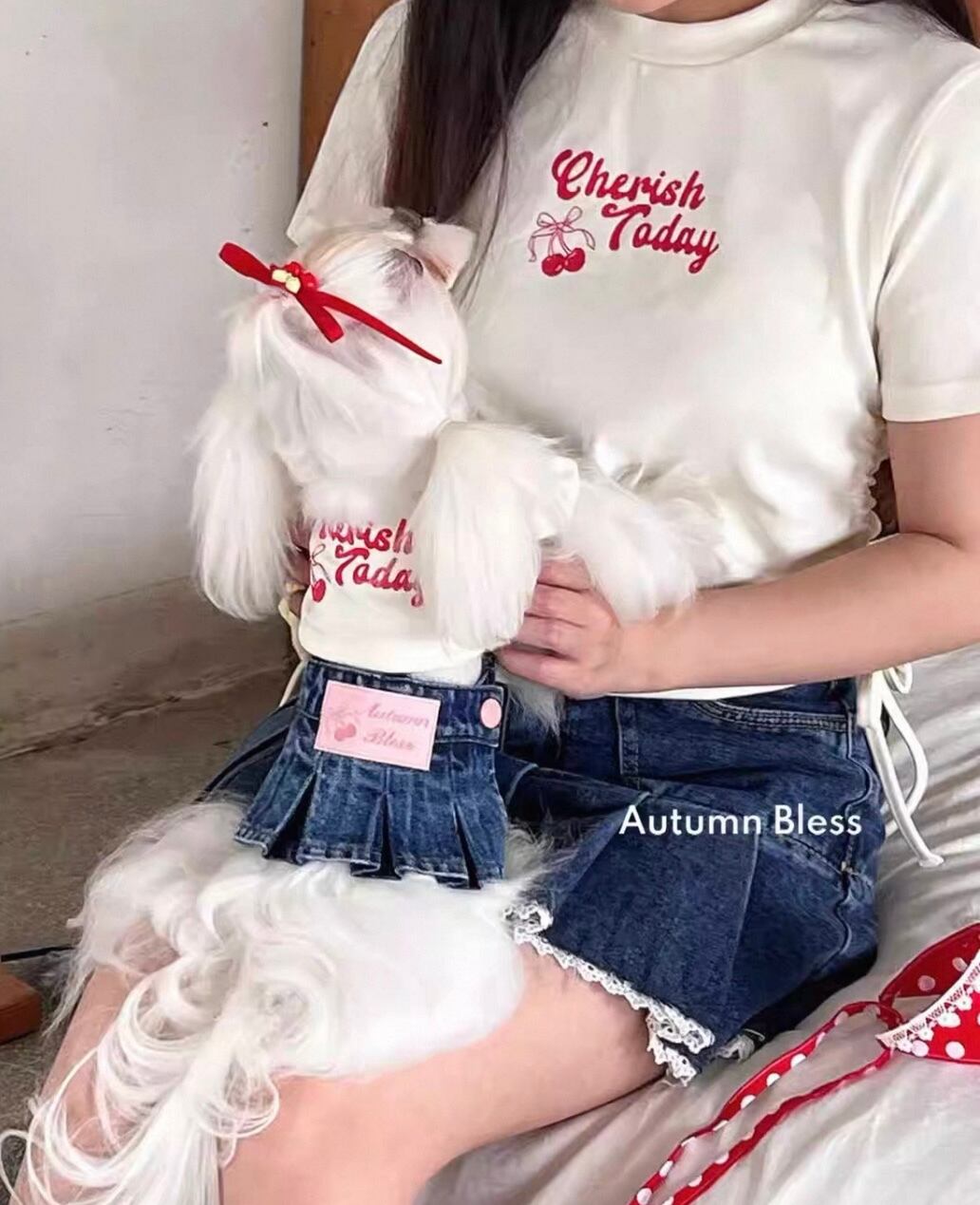 ・犬用:チェリーTシャツ(グレー/ホワイト)+デニムスカート+アクセサリー(ヘアピン or バンダナ)