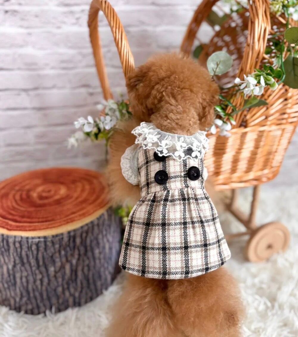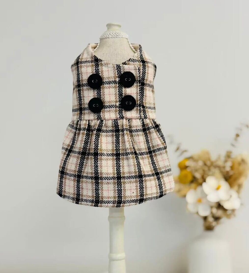 柔らかくて温かみのある チェック柄生地で仕立てられたこのドレスは、クラシックなチェック柄と洗練されたダブルボタンのフロントデザインを組み合わせています♡♡優しいベージュのトーンと構築的なシルエットが、洗練された女性らしい印象を演出します♡お出かけ、カフェ、冬の写真撮影に最適です♬.*゚