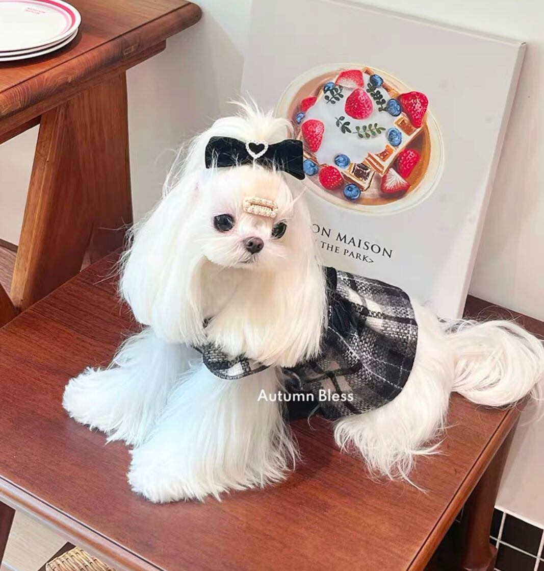 クラシックなチェック柄、繊細なフリル、そして上品なベルベットリボンが特徴のこのドレスは