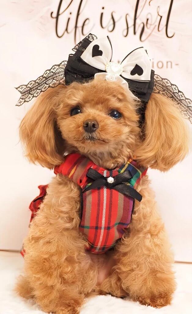 クラシックな赤いタータンチェック柄にハートやリボンの装飾があしらわれたとても可愛いデザインです♡♡立体感のあるフリルがエレガントで