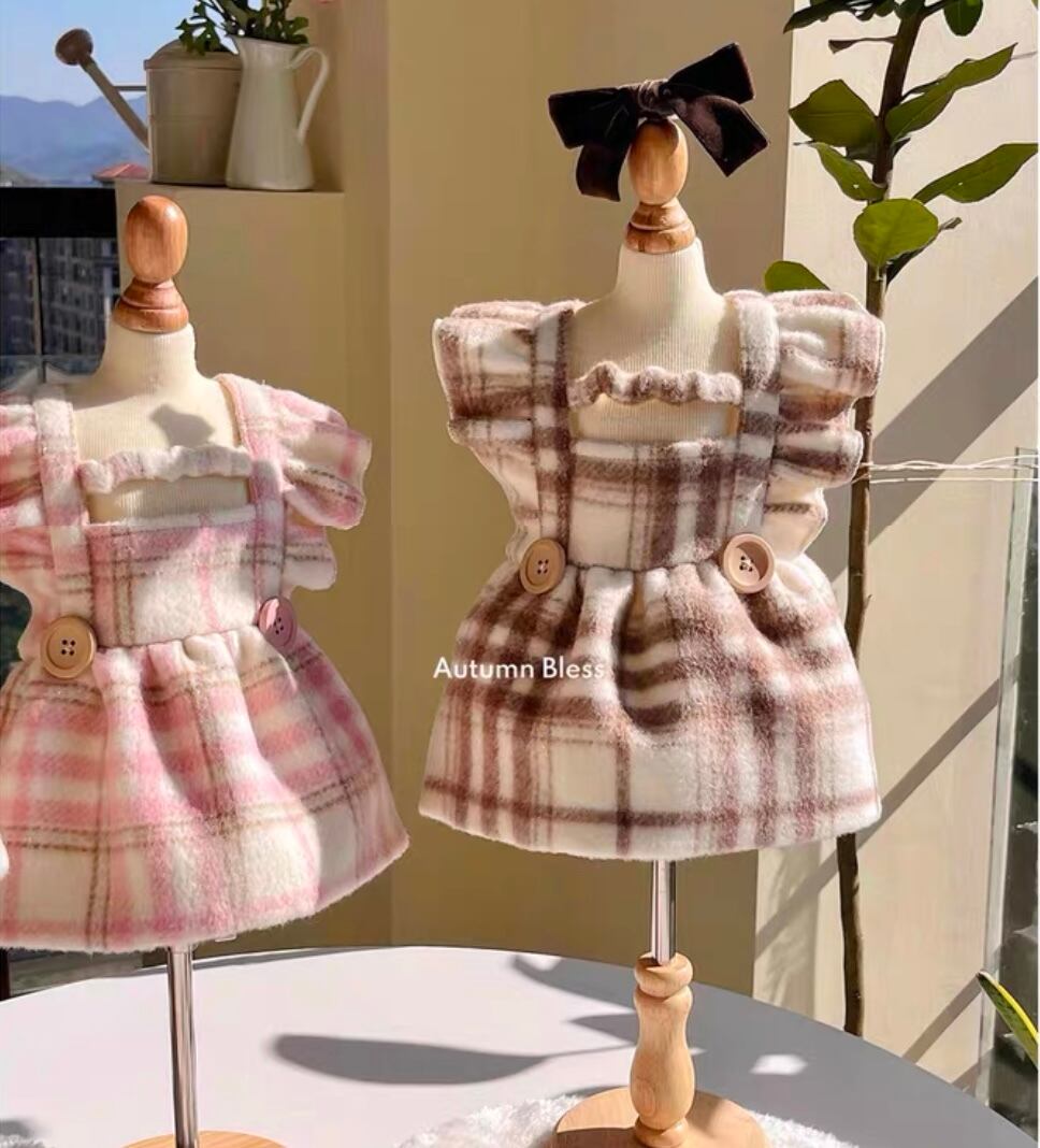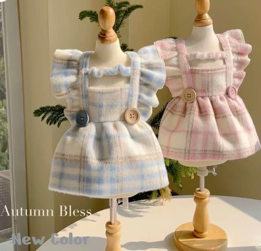 ワンピース♡クラシックなチェック柄に、小さなフリル袖と可愛らしいボタンアクセントが上品さを演出します。ウール混素材で暖かく快適な着心地を実現し、秋冬の季節にぴったり♡お出かけや特別なイベントにも最適な一枚です。おしゃれで実用的なデザインで、愛犬ちゃんの魅力を引き立てます໒꒱